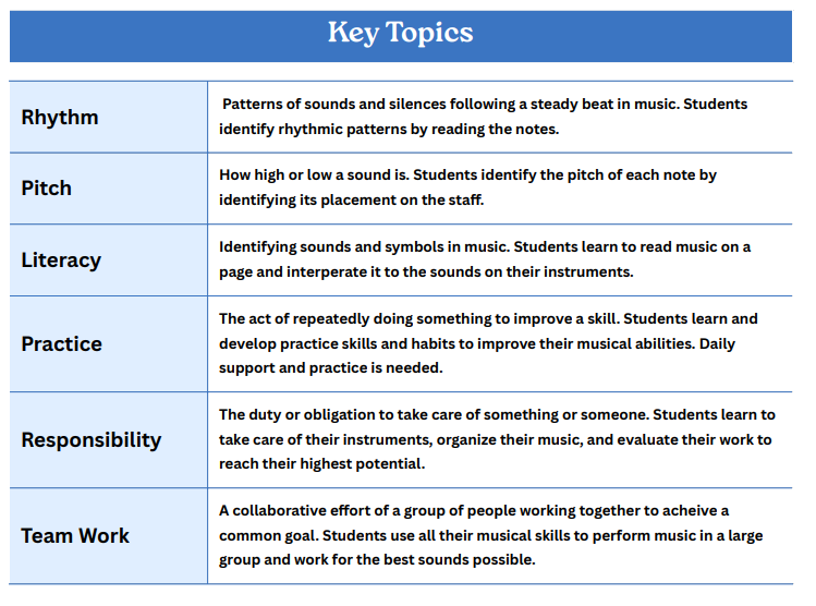 Starting in 1st grade, students start preparing for their future band instruments by using the flutophone. The flutophone is a simplified recorder. It shares many techniques and skills with the recorder and band instruments but is less complex making it ideal for young students. Once students have a good foundation with the flutophone, they are able to easily transition to the slightly more complex recorder. In 1st grade, students develop fine motor skills in their fingers, air control, posture, articulation practices, rhythm and note reading, practice skills and habits, and music literacy. In 2nd grade, students continue developing their skills from 1st grade with the recorder. Additionally, the students dive into music history, deeper instrument family history, how sound is created, percussion basics, basic song creation, and test out the band instruments to find their best fit.